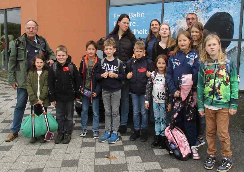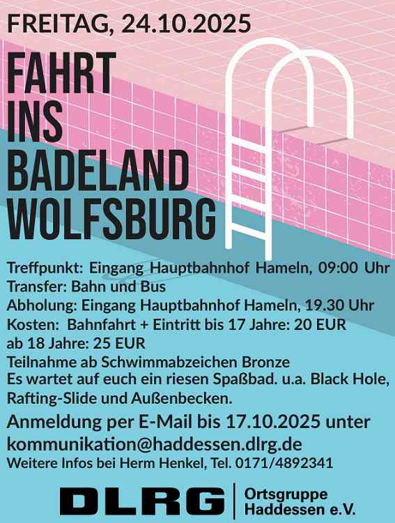 Am Freitag, den 24. Oktober 2025, fuhren wieder DLRG-Mitglieder aus der DLRG-Ortsgruppe Haddessen ins Badeland nach Wolfsburg. 10 Kinder und 4 Erwachsene bildeten eine überschaubare Gruppe, die einen schönen Tag zum Ende der Herbstferien erlebte. Nach dem Treffen vor dem Hauptbahnhof in Hameln fuhren wir mit dem Zug über Hildesheim und Braunschweig nach Wolfsburg. In Wolfsburg pünktlich angekommen, ging es weiter mit dem Stadtbus vorbei am Phaeno, am VfL-Stadion, an der Autostadt und dem Wolfsburg-Schloss zum Badeland. Hier erwarteten uns Wellenbad, Sportschwimmbecken, Tauch- und Springerbecken, Außenströmungskanal, Whirlpool und super Rutschen. Alle konnten sich nach Lust und Laune austoben. Die 4 Stunden im Hallenbad vergingen viel zu schnell. Nach dem obligatorischen Gruppenfoto vor dem Badeland mussten alle zügig zurück zum Hauptbahnhof in Wolfsburg fahren. Dort angekommen, wurde noch einmal die Zeit genutzt, um Proviant in den kleinen Geschäften im Bahnhof einzukaufen.