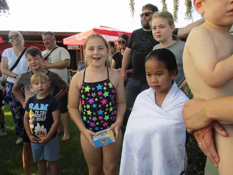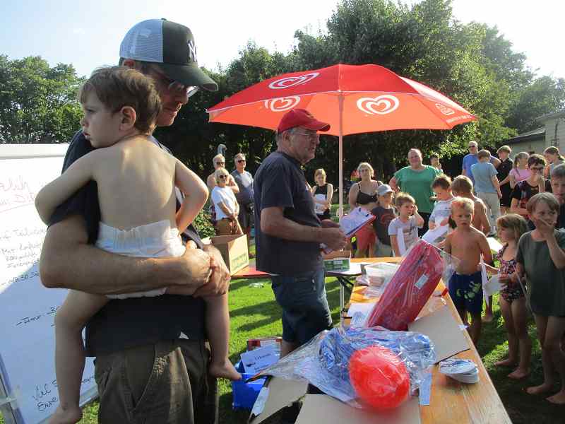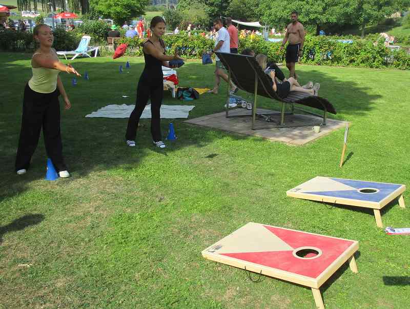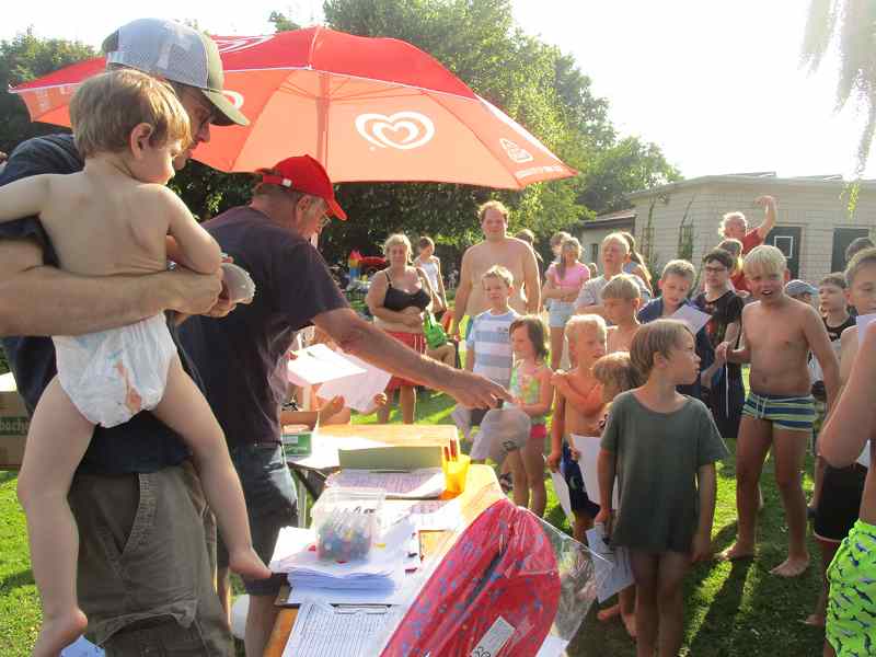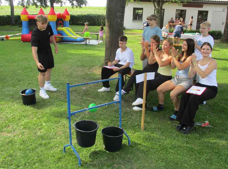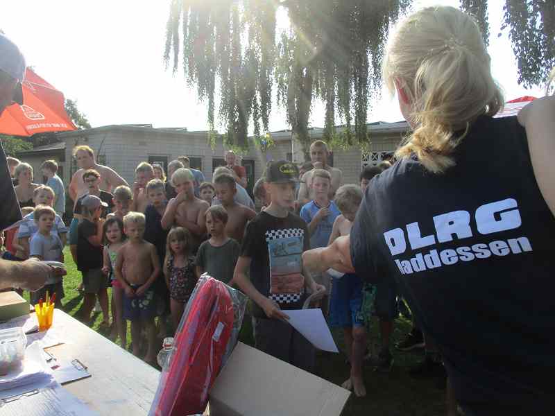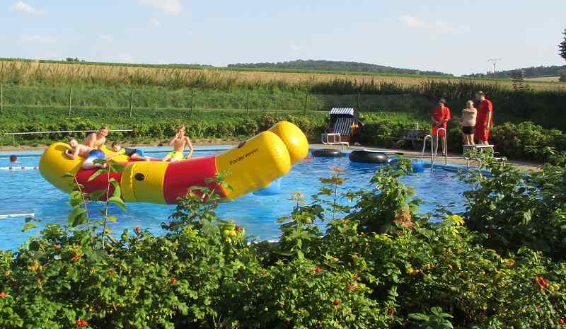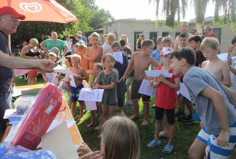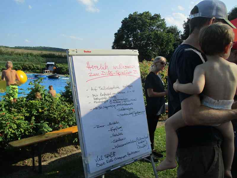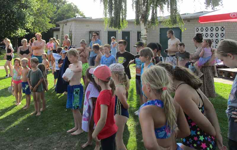 Wie immer stand bei so einer Open-Air-Veranstaltung alles unter dem Vorbehalt des Wetters. Aber die Bedingungen waren ideal am Samstag, den 09. August: Die Lufttemperatur pendelte sich bei 28 °C ein, das Wasser war mit 23 °C auch sehr angenehm. Am Nachmittag von 15.00–18.00 Uhr standen Angebote für Kinder und Familien im Mittelpunkt. An 10 Stationen mussten folgende Aufgaben auf dem Spielparcours erledigt werden: brennendes Haus löschen, Dosen werfen, Flaschen kegeln, Schubkarrenparcours, pendelnde Eimer treffen, heißen Draht, Cornhole, Wasserbomben-Zielscheibe, Schatzsuche und Schätzaufgabe. Im Schatten unter den hohen Bäumen konnten Kinder an einem Malwettbewerb teilnehmen und basteln. Auf dem Schwimmbecken lockte eine 10 m lange und 5 m breite Wasserschaukel, Badematten und Reifen. Auf der Liegewiese konnten sich Kinder noch auf der Hüpfburg austoben. Das Angebot am DLRG-Grillstand und vom Kiosk sorgte für das entsprechende leibliche Wohl. 60 Kinder holten sich den Laufzettel ab und wurden oft von Geschwistern, Eltern, Freundinnen und Freunden begleitet. An die 100 Personen vergnügten sich auf dem Gelände des Freibades.