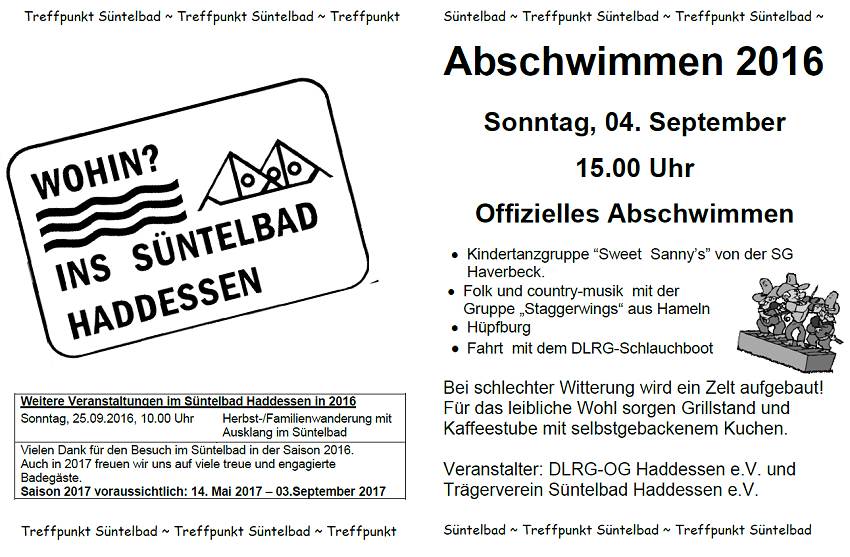 Dank geht an alle Helfer und Mitarbeiter, an die vielen Kuchen- und Tortenspender, und an alle Besucher des Abschwimmens, die trotz widriger Witterungsumstände ins Süntelbad gekommen sind. Getreu unserm langjährigen Motto: Wohin? Ins Süntelbad Haddessen.