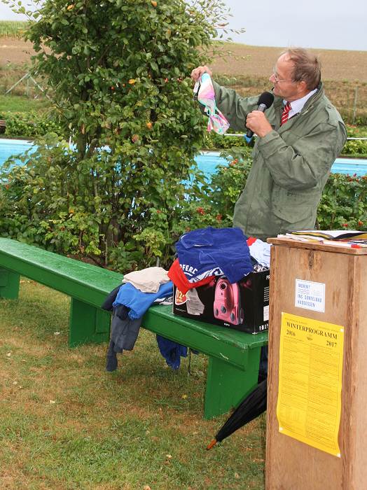 Während es bei den Vorbereitungen zum Abschwimmen 2016 am Samstagvormittag noch trocken war, regnete es fast den ganzen Sonntag. Glück im Unglück: Am Tag des Abschwimmens, gegen 15.00 Uhr wurde es besser, es klarte auf und es schien zeitweilig sogar die Sonne, um 17.00 Uhr war das aber mit plötzlich aufkommenden Gewitterschauern dann nicht mehr möglich, die Gäste suchten den Heimweg und nur ein harter Kern blieb noch zurück.