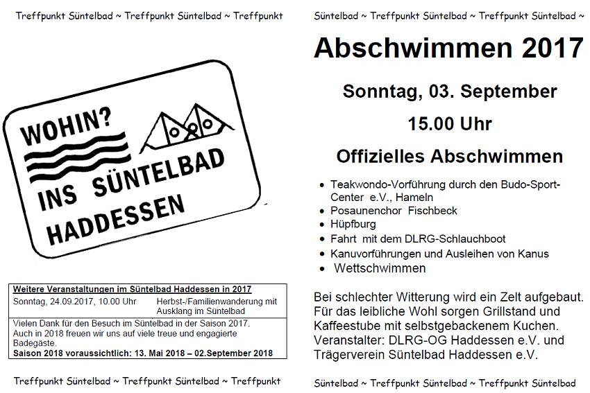 Dank geht an alle Helfer und Mitarbeiter, an die vielen Kuchen.- und Tortenspender, und an alle Besucher des Abschwimmens, die bei dem herrlichen Spätsommerwetter noch einmal ins Süntelbad gekommen sind. Getreu unserm langjährigen Motto: