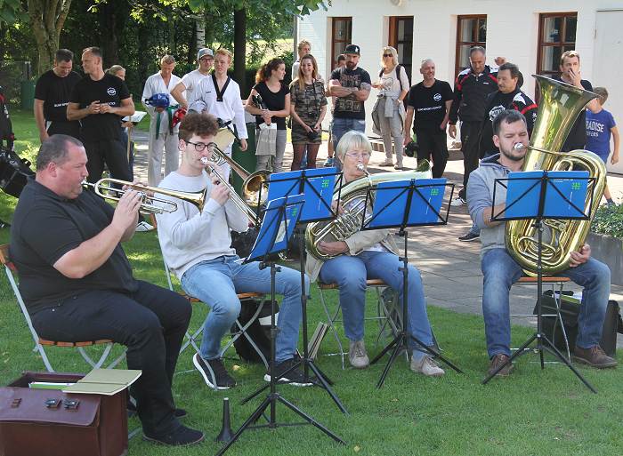 Nach und nach füllte sich das Zelt und die Kaffeestube, die aktiven Sportler der Teakwondo-Gruppe des Budo-Sport-Center Hameln trafen ein und die Musiker des Posaunenchor Fischbeck bauten Ihre Instrumente auf. Unter den ca. 150 Gästen konnten wir unter anderem Ortsbürgermeister Koch , den 1.Vors. vom Trägerverein Süntelbad Haddessen Heinz Beißner, den Bürgermeister der Stadt Hess.-Oldendorf, Herrn Krüger und weitere Politiker des Ortsrates Süntel, der Stadt Hameln und des Kreistages des LK Hameln-Pyrmont und Stammgäste des Süntelbad Haddessen begrüßen.