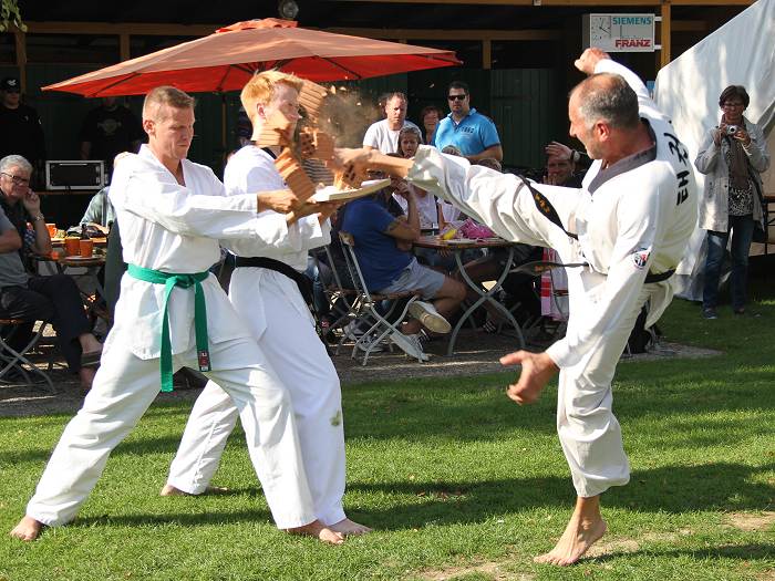 Der Posaunenchor Fischbeck stimmte uns alle ein und nach dem traditionellen, offenbar unausweichlichen Rückblick auf die Saison 2017 hielten die Sportler vom Hamelner Budo-Sport Center die Zuschauer in Atem. Für eine halbe Stunde flogen Steine, Bretter und Angreifer durch die Luft. Eine faszinierende Vorführung der Teakwondo-Sportler unter der Leitung von Herrn Springer, Pötzen. Ein tosender Applaus war ihnen allen sicher.
