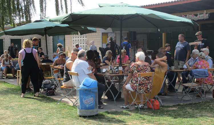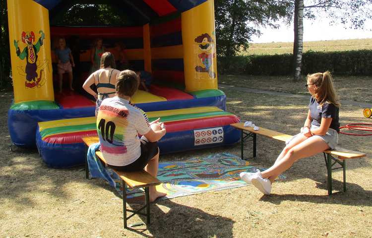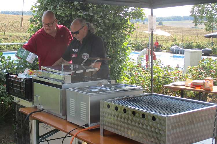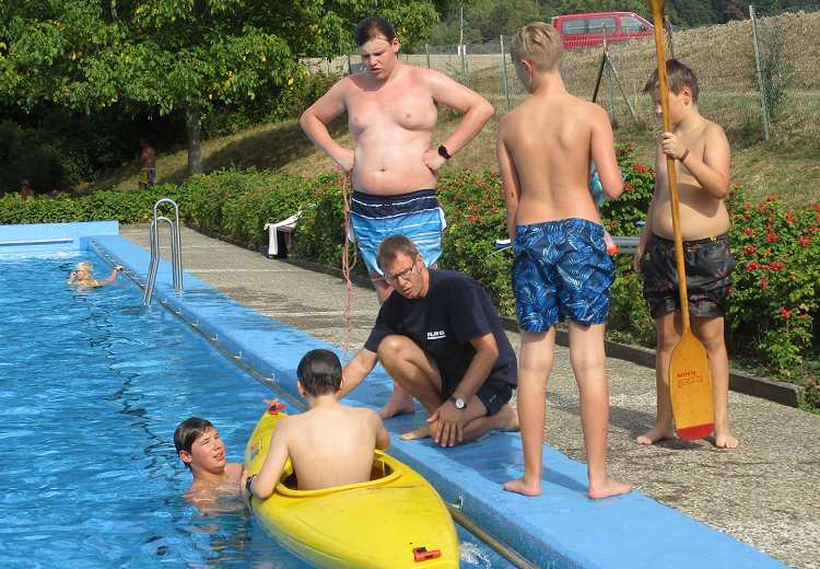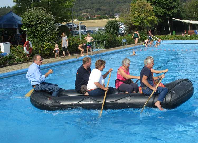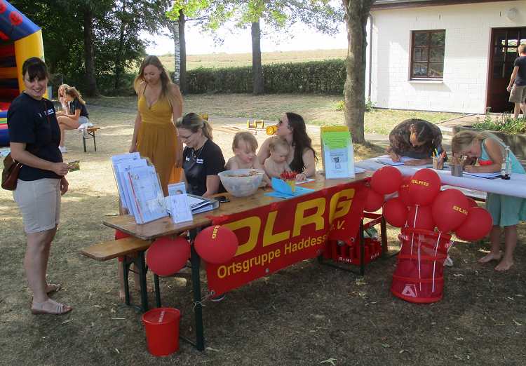 Immerhin war die Wassertemperatur noch bei 19 Grad Celsius, so dass sich doch einige Schwimmer ins Wasser stürzten, nach den versenkten Trinkpäckchen tauchten und viel Spaß und Freude beim schwimmen und herumtollen im Wasser hatten. Die Gäste erfreuten sich in der Kaffeestube an Kaffee, selbstgebackenem Kuchen und Torten, am Grillstand bruzzelten Würstchen, Pommes und Steaks, der DJ hatte seine Anlage aufgebaut und Kioskmitarbeiter waren einsatzbereit, auf der Wasserfläche konnte mit Kanu oder dem DLRG-Schlauchboot gefahren werden, die Hüpfburg und das Angebot des Kinder- und Jugendtreffs auf der Liegewiese lockte die jüngsten Besucher und eifrige Sportler konnten Basketball oder Volleyball spielen.