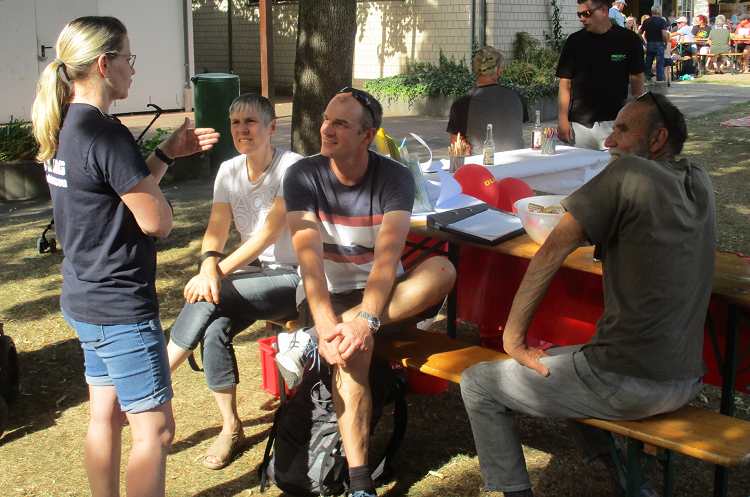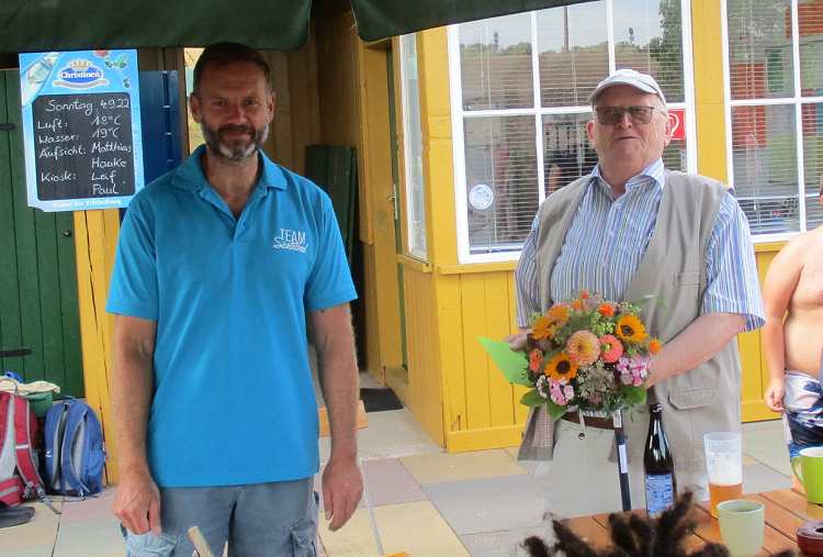 Die Sonne schien aus allen Löchern und die Lufttemperatur stieg von 18 Grad C. morgens um 10.00 Uhr zu Betriebsbeginn auf 29 Grad C. in den Nachmittagsstunden. Kein Wunder, das recht viele Besucher der Einladung zum Abschwimmen folgten. Bereits vormittags kamen die Dauergäste zum Schwimmen, währenddessen fleißige Helfer die Angebote für den Nachmittag aufbauten.