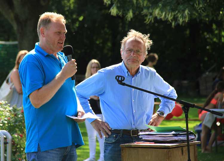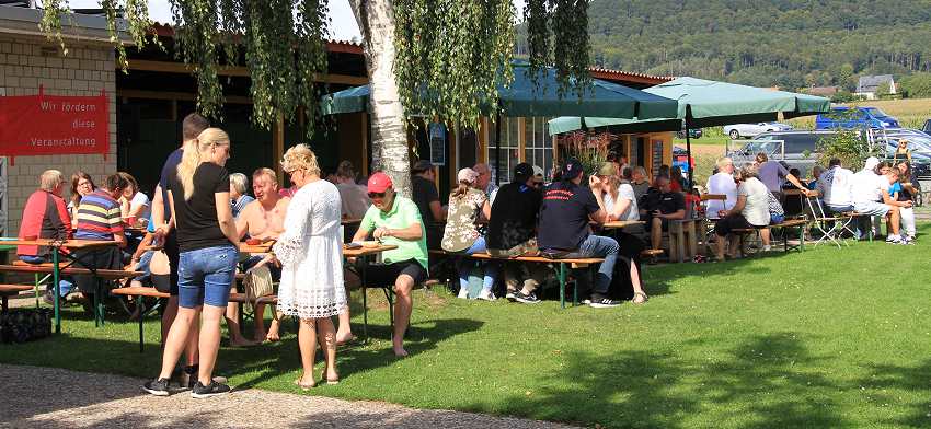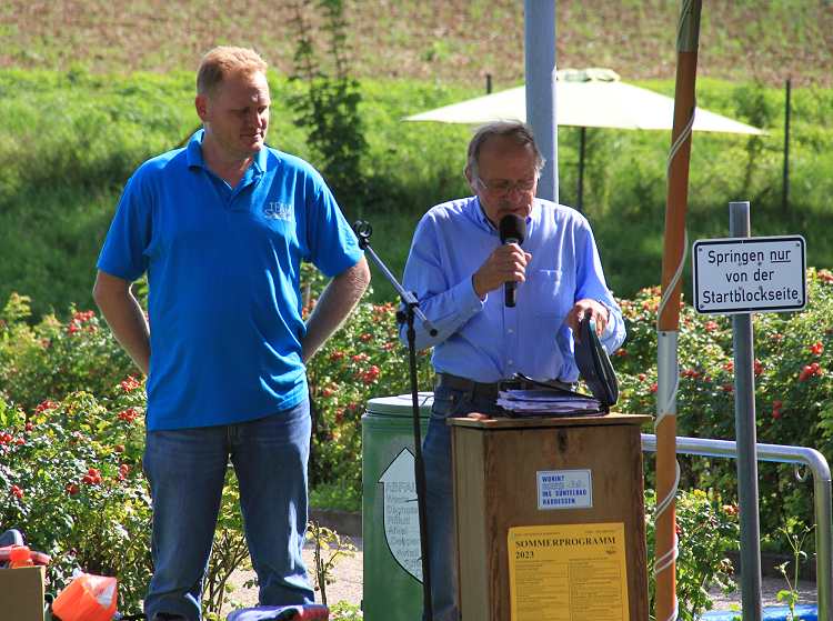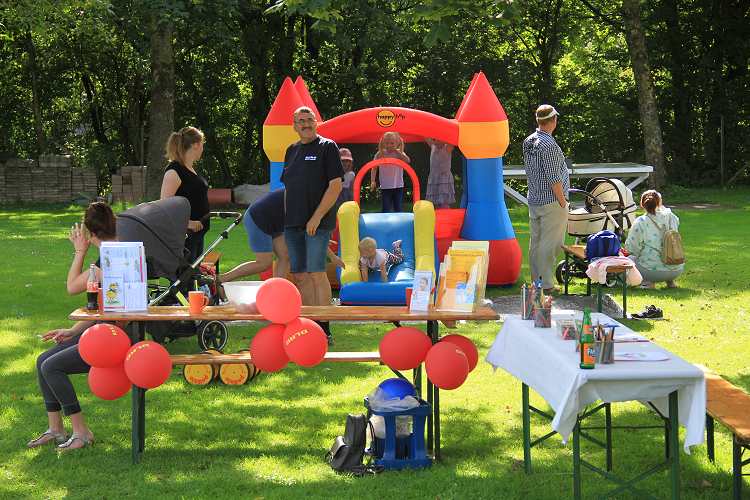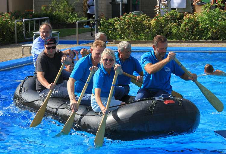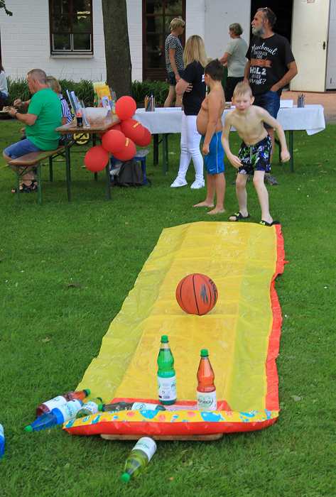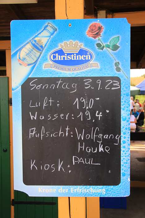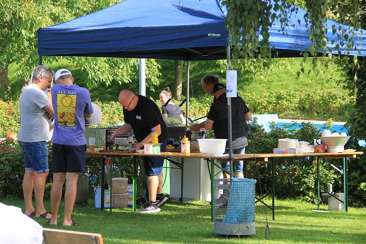 Immerhin war die Wassertemperatur noch so, dass sich doch einige Schwimmer nachmittags ins Wasser stürzten, nach den versenkten Trinkpäckchen tauchten und viel Spaß und Freude beim Schwimmen und Herumtollen im Wasser hatten. Die Gäste erfreuten sich in der Kaffeestube an Kaffee, selbstgebackenem Kuchen und Torten, am Grillstand bruzzelten Würstchen und Pommes, der DJ hatte seine Anlage aufgebaut und Kioskmitarbeiter waren einsatzbereit, auf der Wasserfläche konnte mit Kanu oder dem DLRG-Schlauchboot gefahren werden, die Hüpfburg und das Angebot des Kinder- und Jugendtreffs auf der Liegewiese mit Spielen und Hüpfburg lockte die jüngsten Besucher und eifrige Sportler konnten Basketball und Fußball spielen.