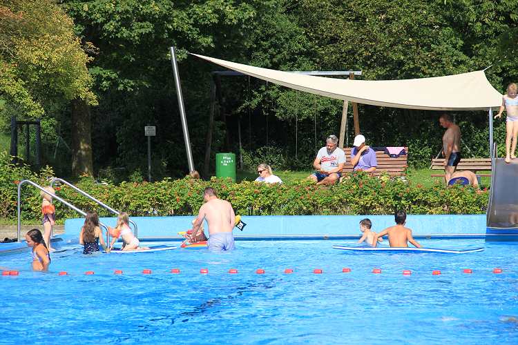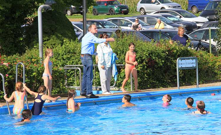 Bei mäßigem Sommerwetter mit 19 Grad Lufttemperatur bei der Öffnung vormittags um 10.00 Uhr und einer Wassertemperatur von 19, 4 Grad C. hielt sich der Andrang am Vormittag in den Grenzen. Aber die Dauergäste kamen und zogen Ihre Bahnen im erfrischenden Wasser des Süntelbad Haddessen, währenddessen fleißige Helfer die Angebote für den Nachmittag aufbauten.