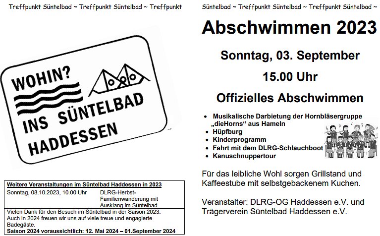 Dank geht an alle Helfer und Mitarbeiter, an die vielen Kuchen - und Tortenspender, und an alle Besucher des Abschwimmens die noch einmal ins Süntelbad gekommen waren. Getreu unserm langjährigen Motto: