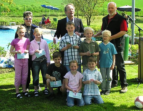 Haddessen/Pötzen "Das ist doch ein Saisonauftakt, wie er im Buche steht", sagte Herm Henkel, DLRG-Vorsitzender des Süntelbades und strahlte mit dem Sonnenschein um die Wette. Den rund 250 Besuchern wurde beim traditionellen Anschwimmen viel geboten. Dafür hatten während der Saisonvorbereitung die Helfer um Herm Henkel exakt 1163 ehrenamtlliche Stunden geleistet - davon allein über 400 Stunden während eines Workcamps in der Osterwoche -, damit das beliebte Freizeitbad wieder in neuem Glanz erstrahlt. Nicht nur die Chlorgassicherheitseinrichtung wurde auf den neuesten technischen Stand gebracht, ein weithin sichtbarer Fahnenmast ziert das Bad jetzt ebenso wie die neu eingefassten Blumenrabatten.