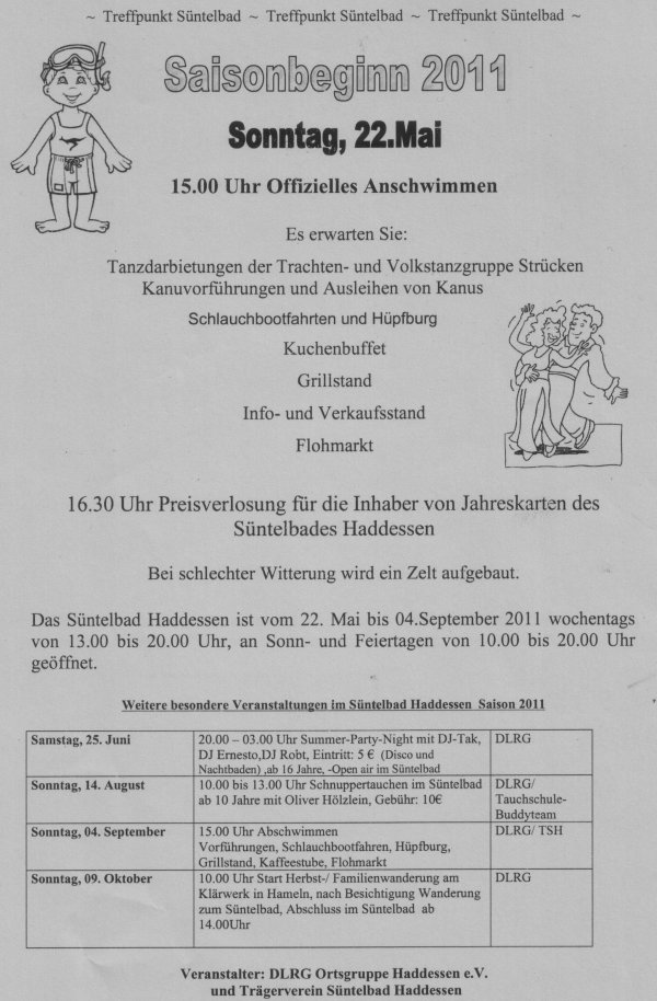Am 22.Mai 2011 war es endlich soweit: Nach über 1100 Stunden Arbeitseinsatz seit Saisonende 2010 konnten die Freunde und Förderer des Süntelbades Haddessen, darunter natürlich sehr viele DLRG Kameradinnen und Kameraden und Gäste des ersten Badetages, 'Ihr' Süntelbad wieder in Betrieb nehmen.