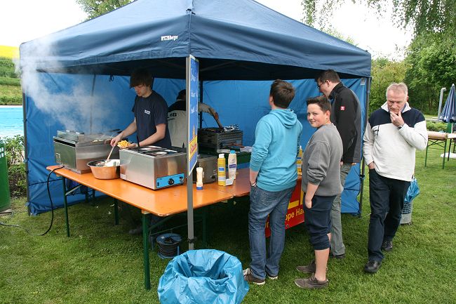Insgesamt 14 Rettungsschwimmer machen in den 16 Wochen Aufsicht im Süntelbad Haddessen. Das Team im Kiosk besteht in dieser Saison aus 5 Mitarbeitern, die sich um das leibliche Wohl der Gäste kümmern und dafür sorgen, das auch etwas Geld in die Eintrittskasse kommt. Im Laufe des Nachmittags verbesserte sich das Wetter, die Sonne sorgte am Abend für angenehme Bedingungen zum Abbau von Zelt, Grillstand , Schlauchboot und Kanus.