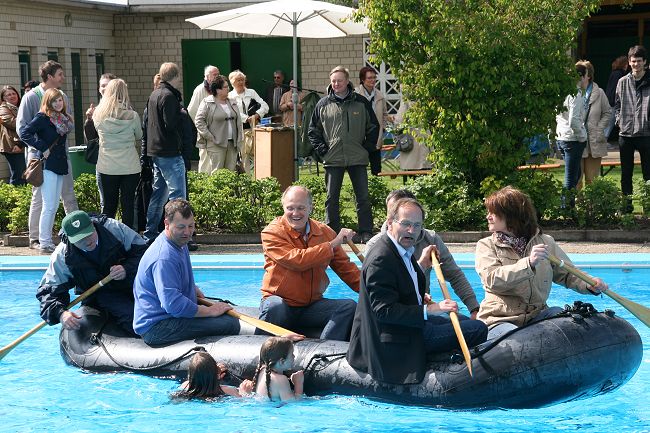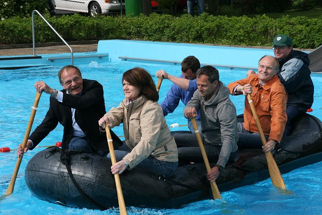 Mitglieder des Rates, der Bürgermeister und Vertreter der DLRG-Ortsgruppe Haddessen unternahmen eine glückliche und kollisionsfreie Fahrt mit dem Schlauchboot im Süntelbad und bewiesen so, dass sie durchaus in der Lage sind, etwas gemeinsam zu schaffen.