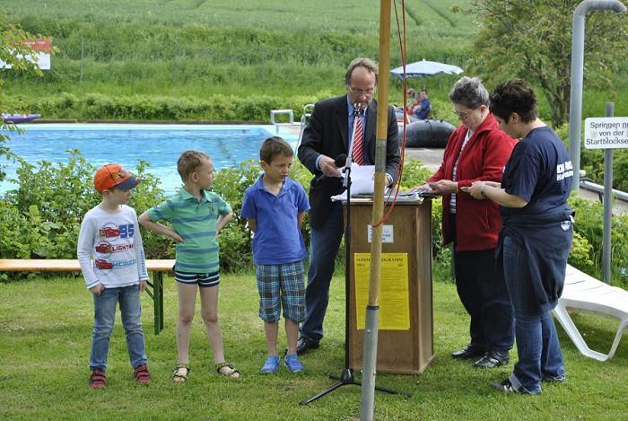 Das sonnige Frühlingswetter lockte viele Zuschauer zum offiziellen Anschwimmen und sie konnten aus den Grußworten von Hans-Heinrich Kardinal, 2. Vors. vom Trägerverein Süntelbad Haddessen, vom Stadtbürgermeister Herrn Krüger und dem Ortsbürgermeister Herrn Koch entnehmen, dass Rat und Verwaltung hinter dem Süntelbad Haddessen stehen und angesichts des hohen ehrenamtlichen Engagements, auch weiterhin Zuschüsse zum Betrieb des Süntelbades gezahlt werden sollen.
