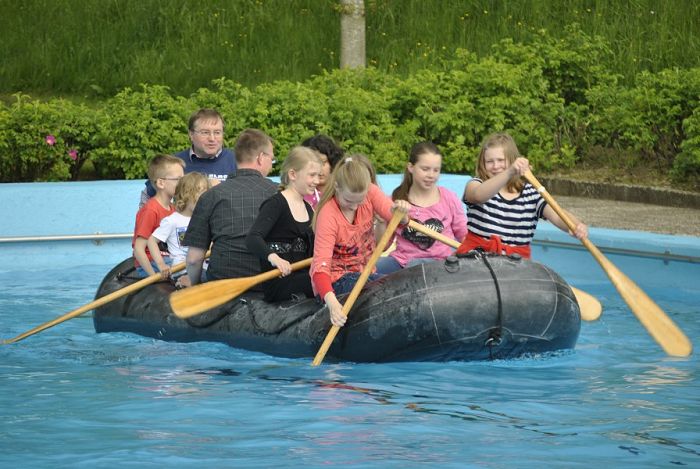 Mitglieder des Rates, des Ortsrates und der DLRG-OG Haddessen unternahmen eine Fahrt mit dem Schlauchboot auf dem großen Schwimmbecken und bewiesen so, dass die Zusammenarbeit auch in diesem Fall funktioniert.