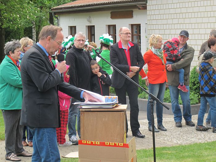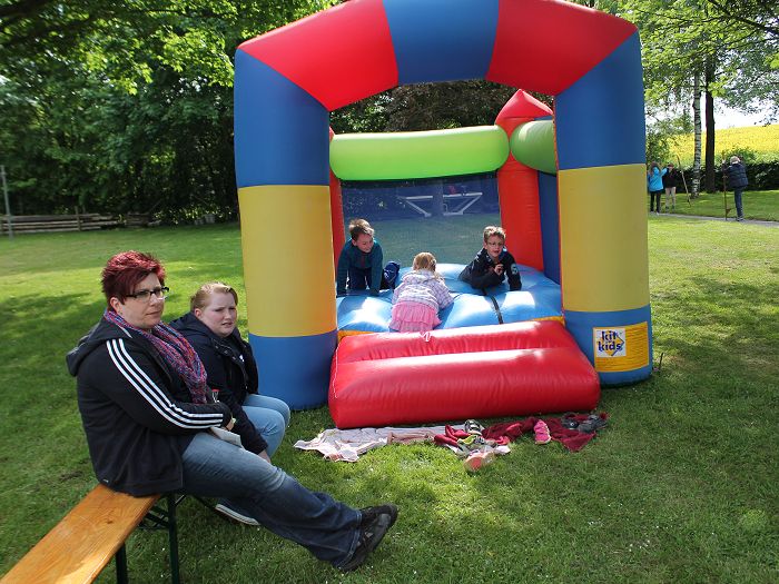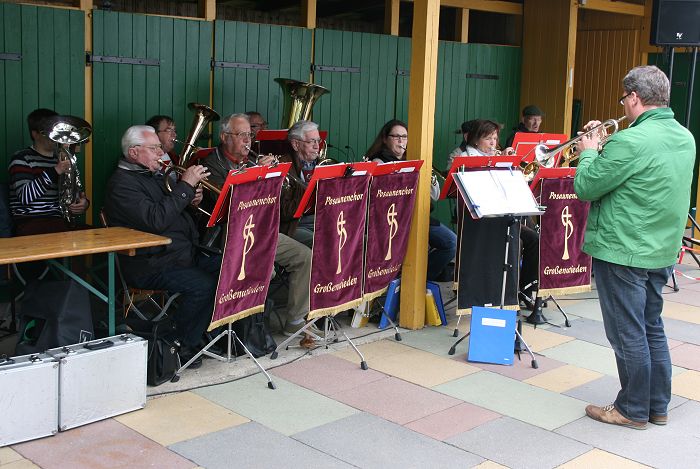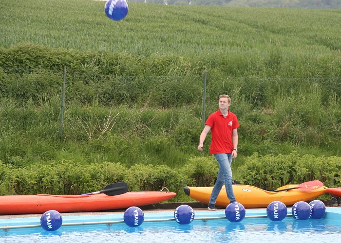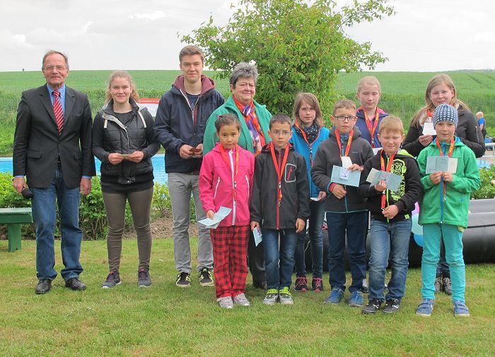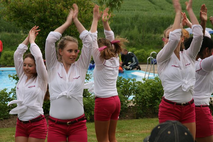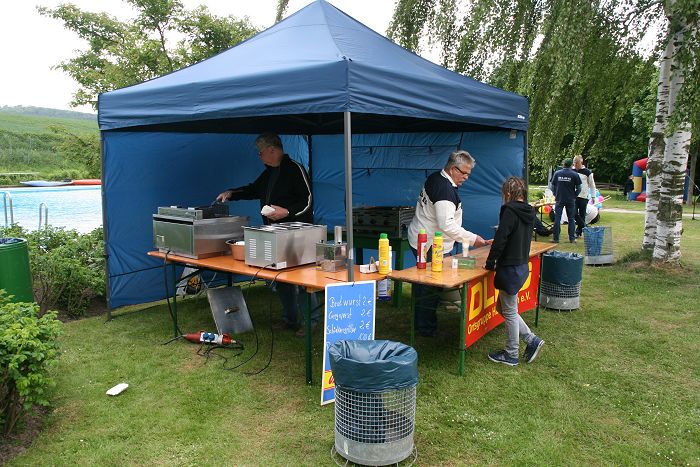 Die ersten Badegäste tummelten sich bei der Baderöffnung bereits im Wasser und tauchten nach versenkten Trinkpäckchen, während die meisten Besucher sich aber an den Angeboten erfreuten, wie da waren Hüpfburg, Kanufahren, Schlauchbootfahren, Tanzdarbietungen der Gruppe 'Wilde Funken' vom TSV Krankenhagen unter der Leitung von Jessica Ludes, Vorführung des Kanu-Club Rinteln unter der Leitung von Marcus Langer, Grillstand, Kaffeestube, DLRG-Losverkauf und natürlich die Verlosung von Preisen unter den Käufern der Saison-Jahreskarten. Diese Preise hatten Firmen gespendet, bei denen ich mich bei dieser Gelegenheit noch einmal recht herzlich bedanken möchte. Musikalisch umrahmt wurde das Anschwimmen vom Posaunenchor Großenwieden unter der Leitung von Herrn Julitz.