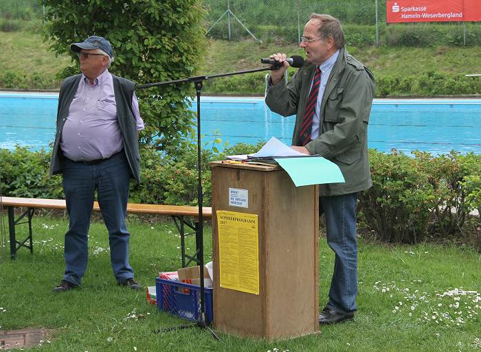 Der Wetterbericht vor dem Anschwimmen am 14.Mai war alles andere als beruhigend: Vormittags schön, nachmittags ab 17.00 Uhr Regen und Gewitter. Schöne Aussichten. Trotz dieser Hiobsbotschaften wurde eifrig auf den Tag der Eröffnung hingearbeitet, hergerichtet und aufgebaut, hatten doch die Helfer und Mitarbeiter der DLRG-Ortsgruppe Haddessen und weitere Helfer in wochenlangem Endspurt geschruppt, gespachtelt, gepinselt, Grünanlagen gepflegt, die Rasenflächen auf Grund der frühen erwachenden Vegetation in diesem Frühling immer wieder gemäht. Insgesamt wurden in diesem Jahr bereits über 850 Arbeitsstunden geleistet.