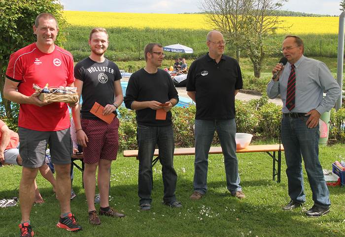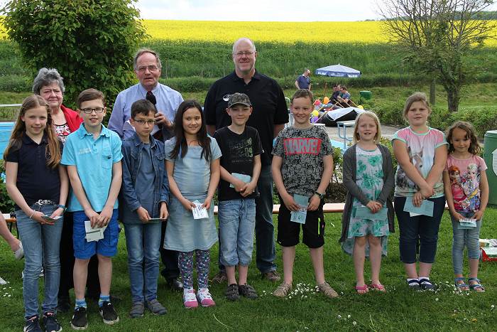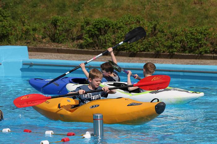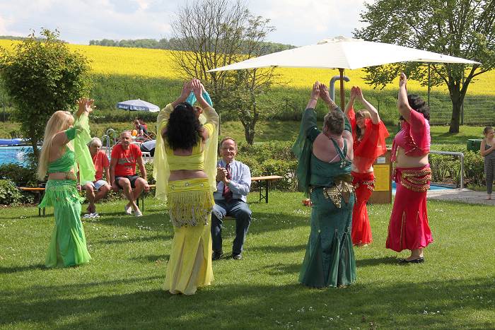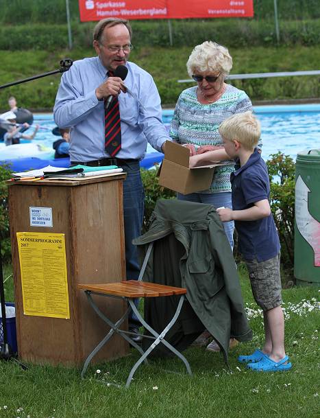 Die ersten 20 Badegäste tummelten sich bei der offiziellen Baderöffnung bereits im Wasser und tauchten nach versenkten Trinkpäckchen, während die meisten Besucher sich aber an den Angeboten erfreuten, wie da waren Hüpfburg, Kanufahren, schwungvolle Tanzdarbietungen der Tanzgruppe vom TSV Bisperode. Weitere Angebote waren Grillstand, Kaffeestube, DLRG-Losverkauf, und natürlich die Verlosung von Preisen unter den Käufern der Saison-Jahreskarten. Diese Preise hatten Firmen gespendet, bei denen ich mich bei dieser Gelegenheit noch einmal recht herzlich bedanken möchte. Musikalisch umrahmt wurde das Anschwimmen durch flotte Musik die DJ Tramax aus Bensen auflegte.