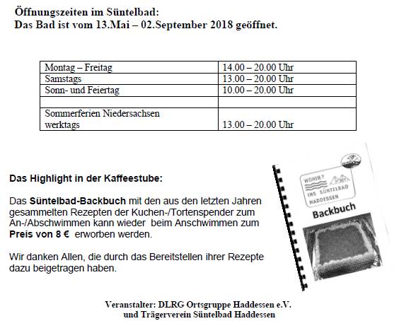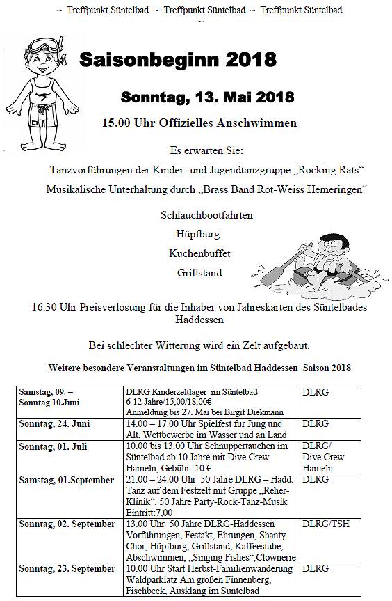 In den nächsten Wochen werden Angebote wie Kinderzeltlager am Süntelbad, Spielfest, Schnuppertauchen, 50 Jahr Feier der DLRG-Ortsgruppe Haddessen mit Abschwimmen und zum Abschluss der Saison die Herbst-Familienwanderung viele Interessierte wieder ins Süntelbad Haddessen locken. Eine neue digitale Temperaturerfassung der Luft und Wassertemperatur sorgt für mehr Orientierung.
