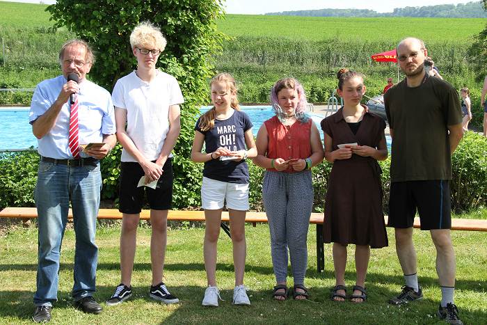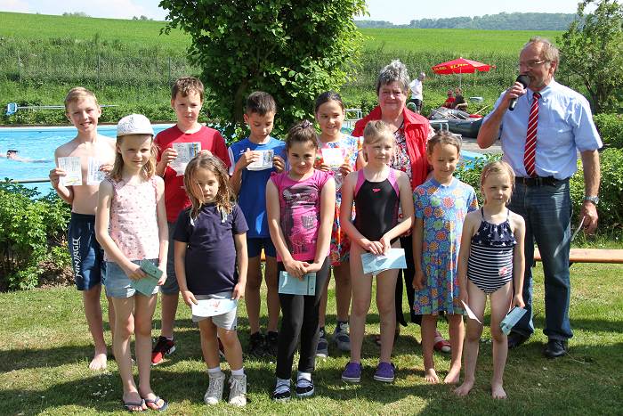 Aus den Händen Ihrer Trainerin Karin Schäfer und des Vorsitzenden Herm Henkel erhielten 18 Kinder Ihre Schwimmurkunden. Die Teilnehmer der Rettungsschwimmausbildung erhielten Ihre Urkunden aus den Händen von Ausbilder Klaus Hoferichter und den Vorsitzenden der DLRG-Ortsgruppe Haddessen, Herm Henkel. Bei dem einladenden Sommerwetter konnten bereits über 60 Jahreskarten, darunter viele Familienkarten, beim Anschwimmen verkauft werden. Insgesamt 11 Rettungsschwimmer machen in den 16 Wochen Aufsicht im Süntelbad Haddessen. Das Team im Kiosk besteht in dieser Saison aus 3 Mitarbeitern, die sich um das Wohl der Gäste kümmern.