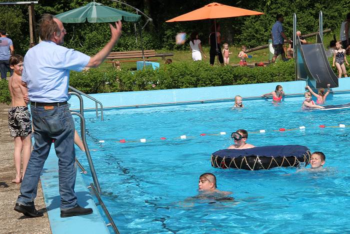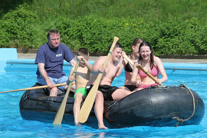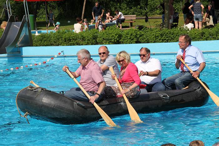 An der obligatorischen Eröffnungs-Fahrt mit dem DLRG-Schlauchboot nahmen Vertreter von Rat und Verwaltung der Stadt Hess.-Oldendorf teil, u.a. Bürgermeister Harald Krüger mit seiner Frau und vom Ortsrat Süntel u.a. Ortsbürgermeister Friedrich Koch teil. Anschließend konnten alle Gäste, jung wie alt, mit dem Schlauchboot auf kleine Fahrt auf dem Schwimmbecken starten.