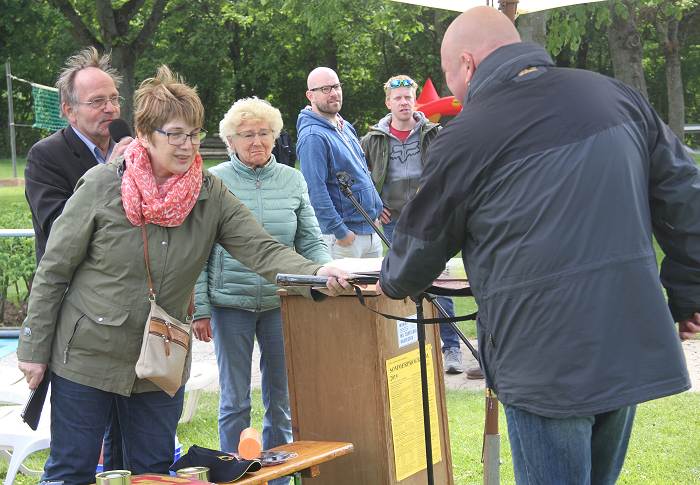Aus den Händen Ihrer Trainerin Karin Schäfer und des stellvertretenden Bürgermeisters Marco Guss und des Vorsitzenden Herm Henkel erhielten zehn Kinder Ihre Schwimmurkunden. Auch den drei Teilnehmern der Rettungsschwimmausbildung wurden Ihre Urkunden überreicht.