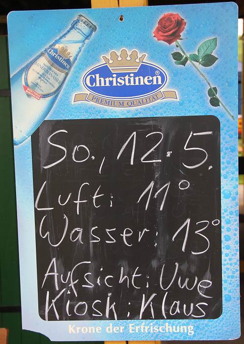 Zeigte das Thermometer vor 3 Wochen an den Osterfeiertagen über 20 Grad, so strahlte am Eröffnungstag für die Saison 2019 die Sonne zumeist nur mäßig vom leicht bewölkten Himmel. Sogar einige Tropfen Regen störten kurzfristig das Anschwimmen, wenngleich der Wetterbericht trockenes Wetter vorher gesagt hatte. Dafür stimmte aber in punkto Temperaturvorhersage der Wetterbericht: Mit 11.Grad C. um 10.00 Uhr und 15. Grad C. im Laufe des Nachmittags war es schon recht frisch.