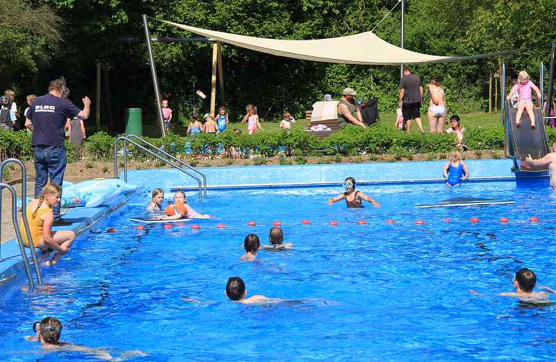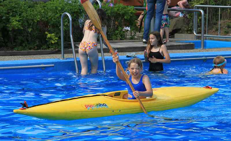 Nach wochenlangen Vorbereitungen, um das Schwimmbecken wieder herzurichten und mit Wasser zu füllen und um die gesamte Umwälzanlage wieder in Gang bringen zu können und vor allem die Chlorgasanlage zu überprüfen, war jetzt der Lohn der Arbeit sichtbar. Die ersten mutigen Badegäste eroberten im Handumdrehen wieder ihre Möglichkeiten wie Badematten, Rutsche, Tauchgeräte.