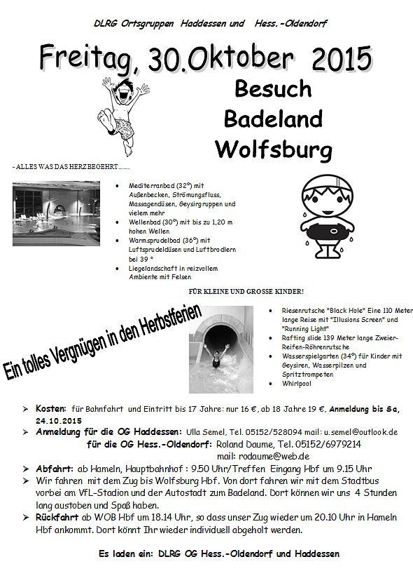 Das Glück blieb uns treu und wir kamen sogar 1 Stunde früher als geplant in Hameln wieder an. Auch wenn aus der Nachbar-DLRG-Ortsgruppe Hess.-Oldendorf diesmal keiner mitfahren konnte, so hat es doch unsern Teilnehmern wieder einmal gut gefallen. Die Teilnehmer werden es weitersagen und im nächsten Jahr werden wir bestimmt wieder mit mehr Teilis Richtung Badeland Wolfsburg starten: Termin ist auch schon festgelegt: Freitag, den 14.Okt 2016, wieder der letzte Freitag in den Herbstferien.
