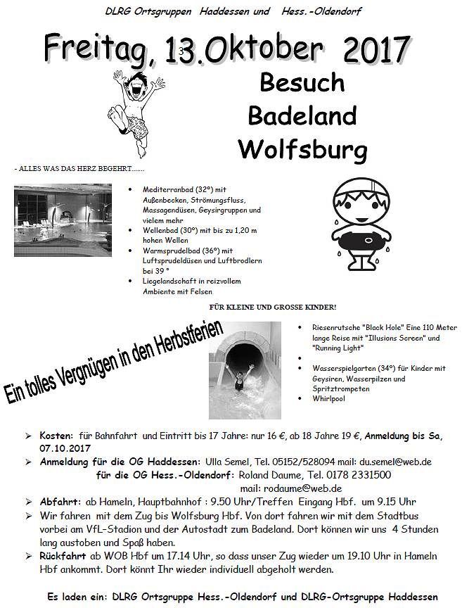 Das Glück blieb uns treu und wir konnten trotz Verspätung des Zuges von Wolfsburg nach Hannover den Anschlusszug nach Hameln noch erreichen - trotz langen Umsteigeweges und dichtem Personenaufkommen im Hauptbahnhof Hannover. Wir sagen Danke dem Jugendvorsitzenden Roland Daume aus der DLRG-Ortsgruppe Hess.-Oldendorf, der uns hilfreich begleitet hat. Allen Teilnehmern hat es wieder einmal sehr gut gefallen. Die Kinder und Jugendlichen werden es weitersagen und im nächsten Jahr werden wir bestimmt wieder Richtung Badeland Wolfsburg starten: Termin ist auch schon festgelegt: Freitag, den 12.Okt 2018, wieder der letzte Freitag in den Herbstferien. Schon mal vormerken - und nicht vergessen.