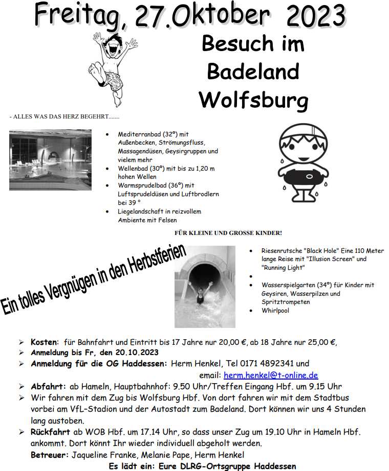 Am Freitag, den 27. Oktober 2023 fuhren wieder DLRG-Mitglieder aus der DLRG-Ortsgruppe Haddessen ins Badeland nach Wolfsburg. 19 Kinder, 2 Erwachsene und 3 Betreuer erlebten einen schönen Tag zum Ende der Herbstferien. Nach dem Treffen vor dem Hauptbahnhof in Hameln fuhren wir mit dem Zug über Hannover nach Wolfsburg.