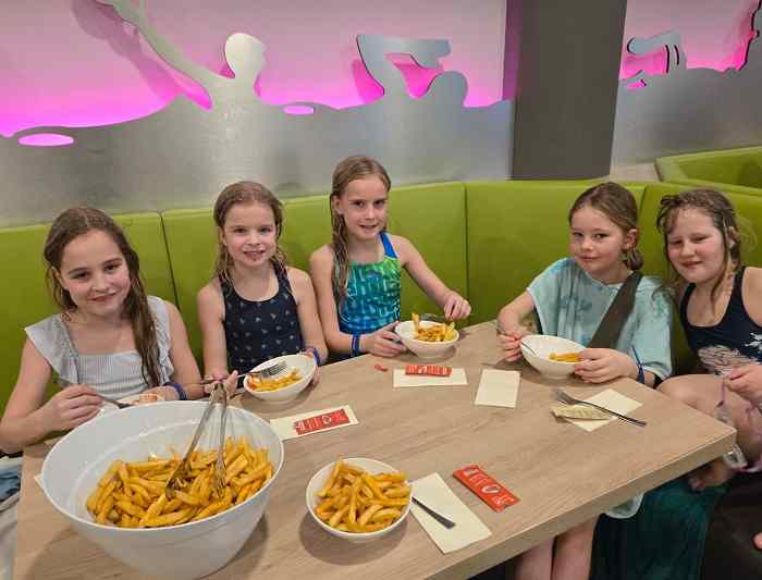 Zur Mittagszeit stärkten sich alle bei einer Portion Pommes, bevor es später wieder ins Wasser ging. Der Ausflug bot viel Gelegenheit zum Toben, Lachen und für gemeinsame Erlebnisse außerhalb des gewohnten Umfelds.