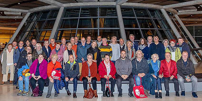 Auf Einladung des Bundestagsabgeordneten Johannes Schraps haben wir von Mittwoch, den 01. November 2023 bis Freitag, den 3. November 2023 mit 9 Teilnehmerinnen und Teilnehmern den Bundestag und andere kulturelle Einrichtungen in Berlin besucht. Zusammen mit 30 weiteren Teilnehmern verschiedener Vereine und Gruppierungen konnten wir 3 Tage an einem Programm, das vom Bundespresse- und Informationsamt ausgearbeitet worden war, teilnehmen. Alles begann mit der gemeinsamen Busfahrt am Mittwoch, den 1. November um 8.00 Uhr ab Hameln in Richtung Berlin. Die Hinfahrt wurde trotz einiger Umleitungen souverän gemeistert und pünktlich um 14.00 Uhr begann unser Besuch im Bundestag mit Sicherheitscheck und einem Vortrag im hohen Haus, dem Bundestag. Da keine Sitzungswoche war, gab es fast nur Besuchergruppen in dem hohen Haus. In einen 40-minütigen Vortrag konnten wir auf der Zuschauertribüne des Plenarsaales erfahren, wie der deutsche Bundestag mit seinen 739 Abgeordneten arbeitet.