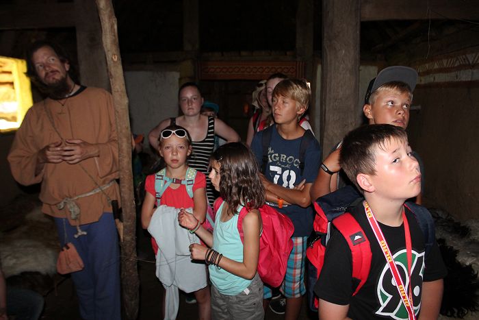 Abends gab es Stockbrot am Lagerfeuer, Völkerball, Spiele im Clubraum oder Basteln im Gruppenraum. Der erste Höhepunkt näherte sich mit Wucht: Schlauchbootfahrt auf dem Fluss Skjern. Was sich zunächst langweilig anhörte, entpuppte sich aber als eine recht abwechslungsreiche 'Busch in Busch Tour': Mal Busch, mal Sandbank, mal Gegenwind, mal Kühe, die sich bei der Pause unaufhörlich näherten. Während die eine Hälfte der Gruppe mit den Schlauchbooten paddelte, besuchte die andere Hälfte ein Eisenzeitmuseum mit tollen Aktivitäten.