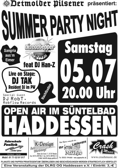 die Summer Party Night am 5.7. im Süntelbad war ein voller Erfolg / 1000 Gäste / super Stimmung / keine größeren Zwischenfälle oder Schlägerein / Top Wetter / Motivierte Mitarbeiter und passende Musik / Live dabei Dj Han-Z vom Dicostepper Dj team, DJ TAK aus dem PW und als Special Guest DJ RobT. aus Göttingen / eine rundum gelungende Veranstaltung Fotos: Steffen Rinne