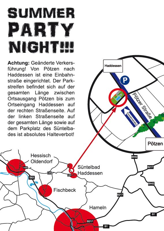 Um den An- und Abreiseverkehr, das Parken und die Offenhaltung der Rettungswege zu gewährleisten, wird die Haddesser/Pötzer Straße am Samstag ab 10 Uhr in Richtung Haddessen zu einer Einbahnstraße! Auf der gesamten Strecke von Pötzen nach Haddessen kann auf der rechten Fahrbahnseite geparkt werden, für die linke Fahrbahnseite wird ein Halteverbot eingerichtet. Der Parkplatz des Süntelbades steht nicht als Parkfläche zur Verfügung!