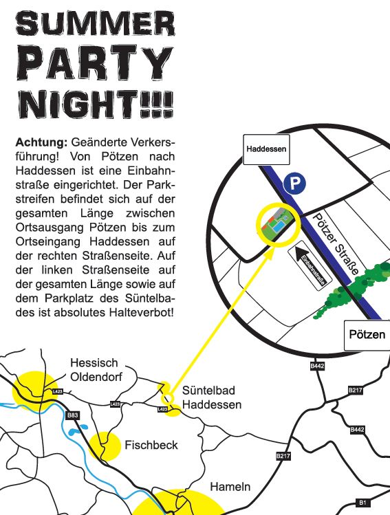 Um den An- und Abreiseverkehr, das Parken und die Offenhaltung der Rettungswege zu gewährleisten, wird die Haddesser/Pötzer Straße am Samstag ab 10 Uhr in Richtung Haddessen zu einer Einbahnstraße! Auf der gesamten Strecke von Pötzen nach Haddessen kann auf der rechten Fahrbahnseite geparkt werden, für die linke Fahrbahnseite wird ein Halteverbot eingerichtet. Der Parkplatz des Süntelbades steht nicht als Parkfläche zur Verfügung!