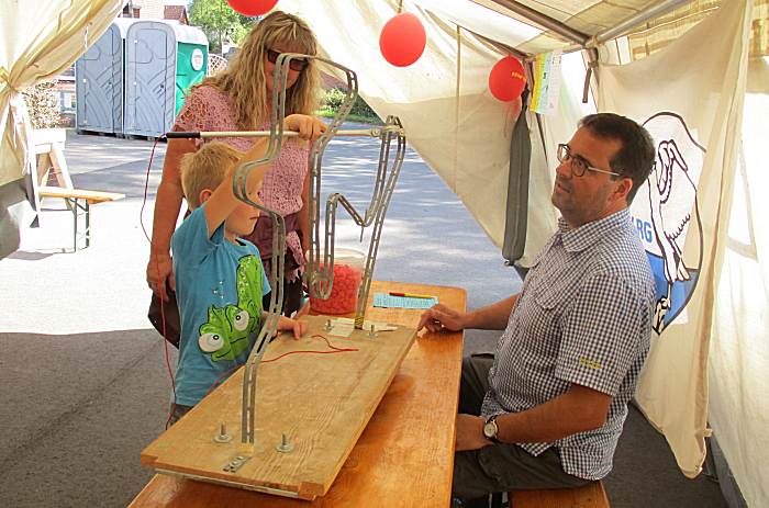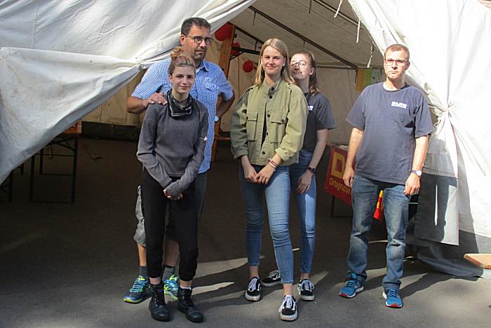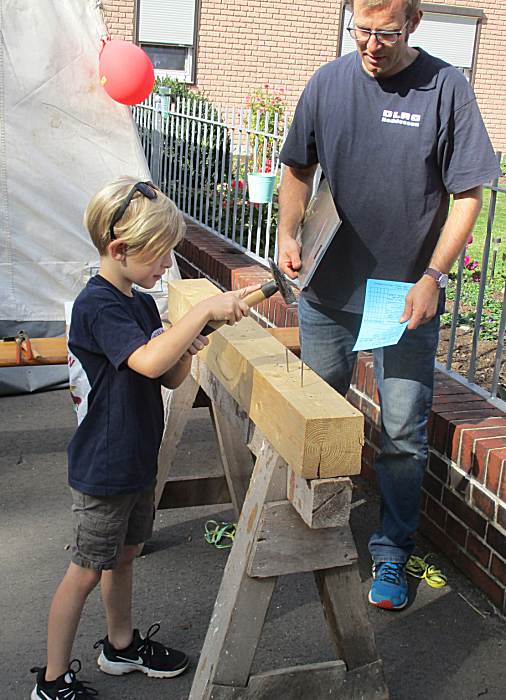Wir, die DLRG-Ortsgruppe Haddessen, hatten uns wie die vielen Jahre vorher auch schon, bereit erklärt, das Kinderprogramm zu gestalten. Beim Aufbau am Samstagvormittag war die Infrastruktur für das Erntefest schon fertig: Die Zelte auf dem Hof Wallbaum standen und waren bunt geschmückt, der Grillstand war aufgebaut und wir machten uns daran, auf dem Hof von Horst Homeier, direkt neben dem Hof des Erntebaiern, das Kinderprogramm aufzubauen. Der Aufbau machte richtig Spaß und Matthias Weiss, Leonie Fröhlich und ich hatten nach 2 Stunden die Spiel- und Infostände fertig aufgebaut und auch ausprobiert: