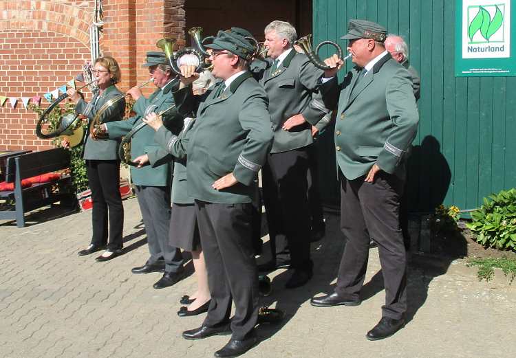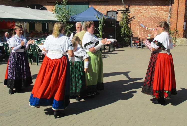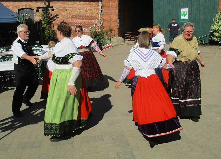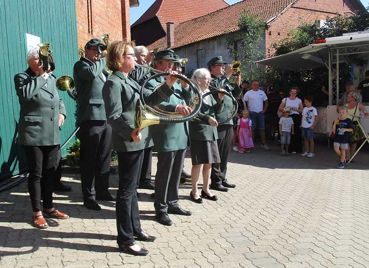 Pünktlich um 15.00 Uhr eröffneten die Jagdhornbläser des Jagdkreises Hameln-Pyrmont unter der Leitung von Herrn Blickwedel mit ihren drei Liedstücken das Erntefest und nach der Begrüßung von Herm Henkel, 1. Vors. der DLRG-Ortsgruppe Haddessen, ging Gerrit Schütte, der Erntebauer des Jahres 2023, auf die Ernte ein. Es folgten die Grußworte der Ortsbürgermeisterin Kirsten Beißner und drei Tänze der Volkstanz- und Trachtengruppe aus Meinsen – Warber. In ihren farbenfrohen Bückeburger Trachten und mit ihren schwungvollen Tänzen begeisterten sie die Zuschauer. Bei hochsommerlichen Temperaturen von 31Grad C eine anstrengende Situation. So verzog es auch die zahlreichen Gäste in schattenspendende Bereiche auf dem Hof.