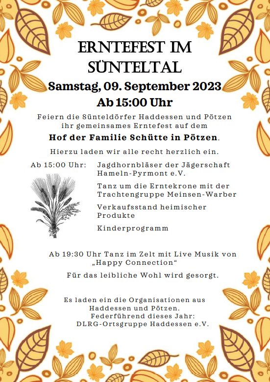 Bereits am 3. Dezember 2022 konnten in einer gemeinsamen Besprechung der drei beteiligten Vereine, der Freiwiligen Feuerwehr Pötzen, der Freiwilligen Feuerwehr Haddessen und der DLRG-Ortsgruppe Haddessen und den drei Erntebauern Wallbaum (Haddessen), Reineke (Pötzen) und Schütte (Pötzen) die Weichen für 2023 gestellt werden: Das Erntefest 2023 konnte am 9.Septemberer 2023 auf dem Hof Schütte in Pötzen stattfinden.