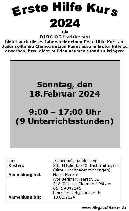 Am Sonntag, den 18.Februar 2024 veranstaltete die DLRG-Ortsgruppe Haddessen den wichtigen Erste Hilfe Kurs für alle Aufsichten im Süntelbad Haddessen und weitere Interessierte. Der Kurs konnte in der „Scheune“ in Haddessen durchgeführt werden.