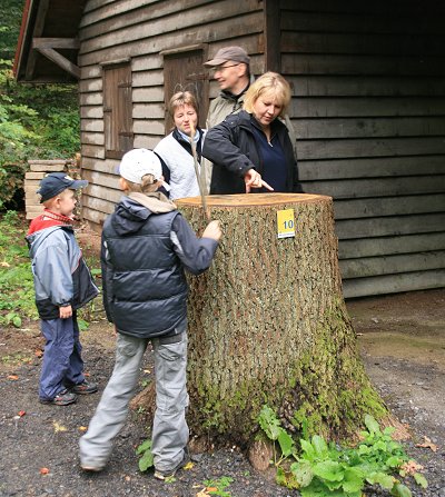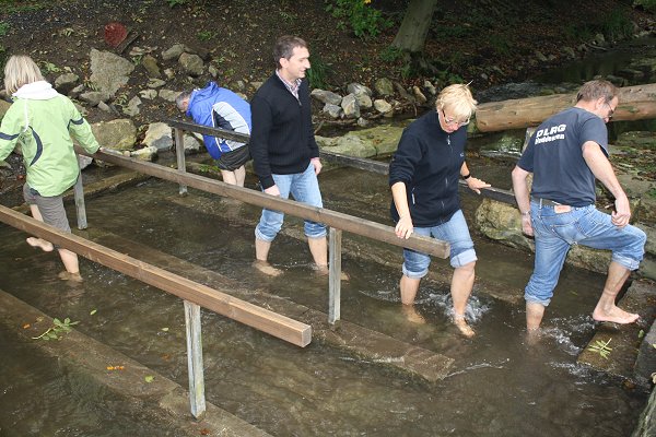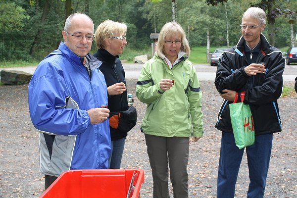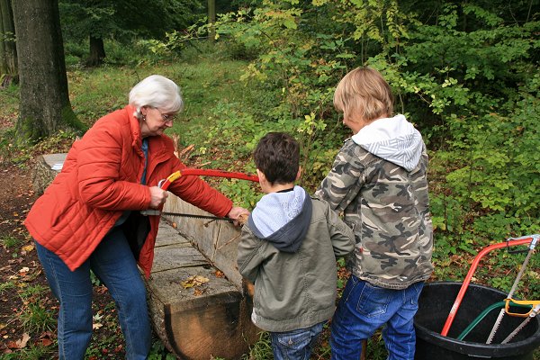 Nach traditionellem Startschluck und erfrischendem Fußbad in der Wassertretstelle am Parkplatz in der Nähe der Pappmühle führte uns die Wanderung durch den südlichen Süntel zum ehemaligen Pflanzgarten, wo eine Teepause mit diversen Aufgaben auf uns wartete. Unter anderem musste die Apfelmenge in einem Korb und der Umfang einer über 100 Jahre alten Eiche geschätzt werden und von einem Holzast 500 Gramm Holz abgesägt werden. Hier waren schätzen, knobeln und Geschicklichkeit gefragt. Natürlich gab es für alle eine Stärkung, ehe auf idyllischen Wegen es weiter zum Ökobauernhof Meier-Köpke in Bensen ging.