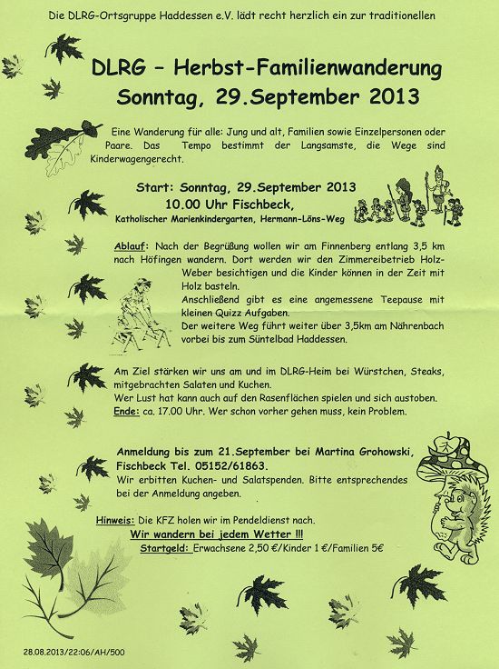 Bei strahlendem Sonnenschein aber eisigem Wind trafen sich 21 Erwachsene und 11 Kinder am 29.Sept 2013 zu traditionellen DLRG-Herbst-Familienwanderung. Nach Begrüßung, small talk und Start-Umtrunk ging es vom katholischen Marienkindergarten in Fischbeck zur Talsperre nordöstlich von Fischbeck. Hier mussten die ersten Aufgaben auf einem Laufzettel beantwortet werden, unter anderem wann der alte Staudamm weggespült worden ist. (1966)