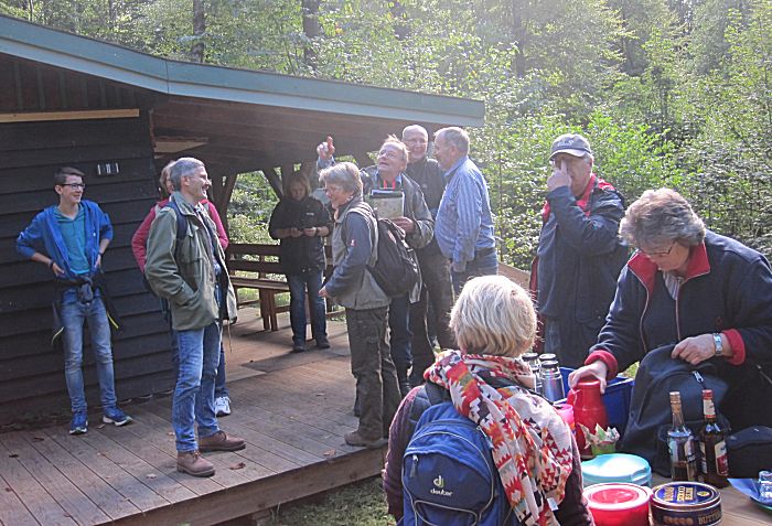 Bald war das Mittagsziel, unsere Teestation, mitten im Wald erreicht: Die emalige Waldarbeiterschutzhütte dient heute als Jagdhütte und wird von dem Jagdpächter Wolfgang Franz aus Pötzen genutzt. Bei herrlichem Sonnenschein konnten wir uns bei Tee und Keksen schnell erholen und Wolfgang Franz informierte uns umfassend über den Süntel und die Jagd. Schon interessant, das der Süntel früher ein Hütewald war und heute 700 Anteile von den Eigentümern in der Süntelwaldgenossenschaft gehalten werden. Buche, Fichte, Ahorn und Esche sind die wichtigsten Baumarten auf diesem kalkhaltigen Höhenzug.