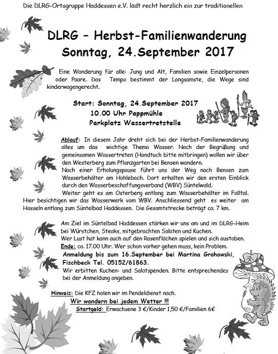 DLRG-Herbst-Familienwanderung 2017 vom Parkplatz am Hohenstein zum Süntelbad Haddessen unter dem Motto: 'Wasser ist Leben'