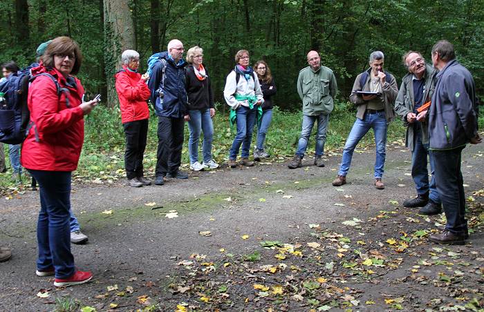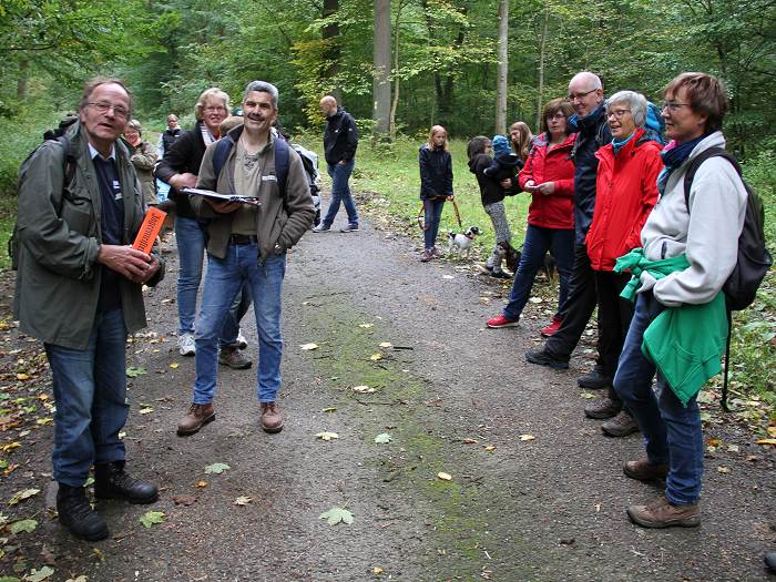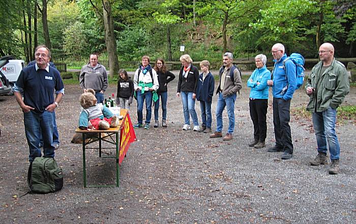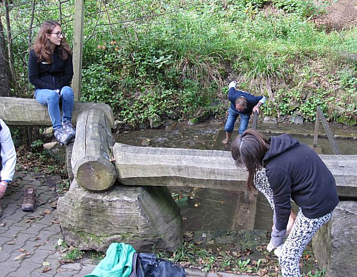 2 Tage nach dem offiziellen Herbstanfanmg sammelten sich 18 Erwachsene und 7 Kinder, teilwiese diese noch im Kinderwagen/ bzw. Kinderkarre und 2 Hunde am Hollenbach unterhalb des Hohensteins, um nach traditioneller Begrüßung mit Umtrunk und einer Runde Süßes etwas über den Hohenstein, den Kreuzstein und das Blutbachtal zu erfahren und sich mit dem Thema Wasser zu beschäftigen. Was lag da nicht näher, als mutig im Wasser des Hollenbaches in der Wassertretstelle neben dem Parkplatz etwas Gutes für die Durchblutung zu tun. Welch herrliche Erfrischung für die Mutigen.