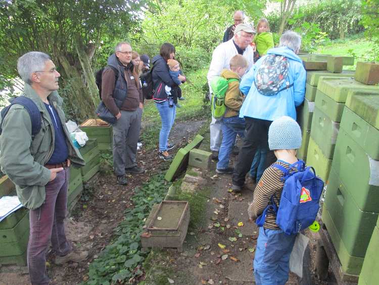 In Steinwurfweite zu dem neuen Hochbehälter gewährte uns Herr Wolfgang Thoms einen Einblick in seine Imkerei und zeigte uns seine Bienenstöcke, die Waben und erzählte uns von dem spannenden Bienenleben der unterschiedlichen Bienen. Zum Schluss durfte jeder mal den Honig auch probieren.