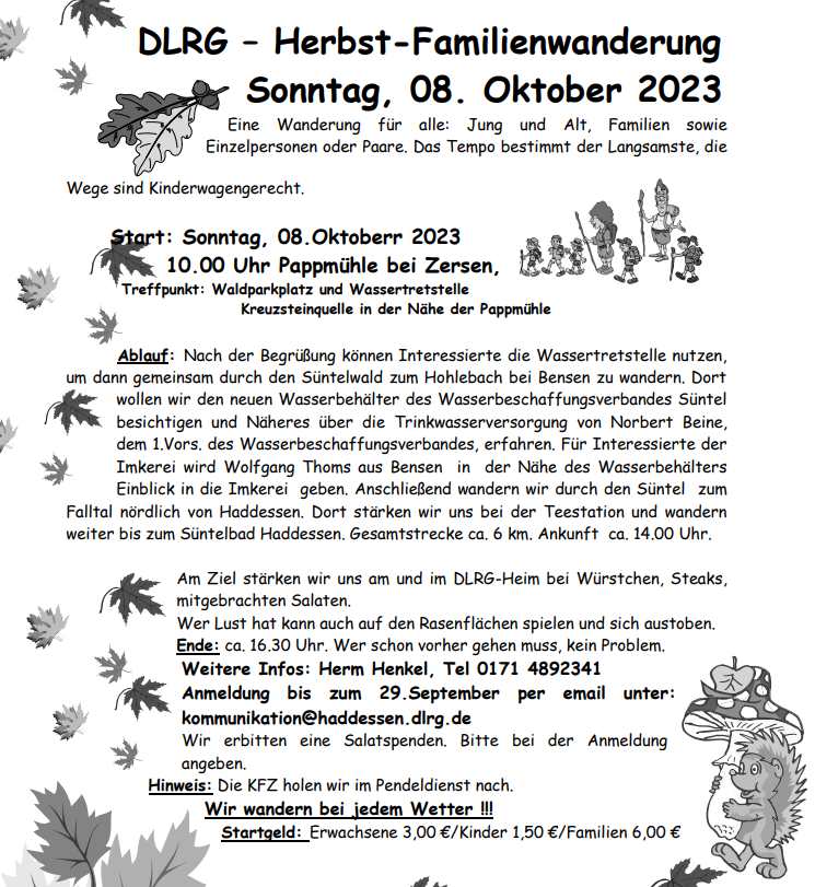 DLRG-Herbst-Familienwanderung 2023 bei bestem Herbstwetter durch den Süntel von der Pappmühle zum Süntelbad Haddessen
