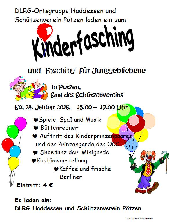 Zum 3.Mal hatten Schützenverein Pötzen und DLRG-Ortsgruppe Haddessen gemeinsam zum traditionellen Kinderfasching eingeladen. DJ Rene und DJ Maximilian sorgten für Musik und das Spielteam Alexandra, Sina und Herm führten durch die Veranstaltung. Nach der obligatorischen Begrüßung ging es gleich zur Sache mit Staffelspielen, wobei es bei Balltransport, Stegbau und Rollbrett-Parcour auf Geschicklichkeit, Kraft und Schnelligkeit ankam. Anschließend gab es natürlich Süßes für die Wettbewerbsteilnehmer.