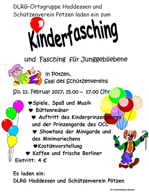 Zum 4. Mal hatten Schützenverein Pötzen und DLRG-Ortsgruppe Haddessen gemeinsam zum traditionellen Kinderfasching und Fasching für Junggebliebene eingeladen. DJ Axel sorgte für Musik und das Spielteam Alexandra, Siiri, Mario und Herm führten durch die Veranstaltung. Nach der obligatorischen Begrüßung ging es gleich zur Sache mit Staffelspielen, wobei es bei Balltransport, Stegbau und Rollbrett-Parcour auf Geschicklichkeit, Kraft und Schnelligkeit ankam. Anschließend gab es natürlich Süßes für die Wettbewerbsteilnehmer.