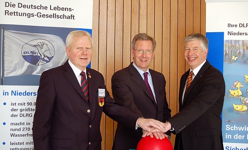 Hannover Am heutigen Tag gab der Niedersächsische Ministerpräsident Christian Wulff im Beisein des Landesverbandspräsidenten der Deutschen Lebens-Rettungs-Gesellschaft (DLRG) in Niedersachsen, Hans-Jürgen Müller, und des Vorstandsvorsitzenden der Sparkasse LeerWittmund, Heinz Feldmann, den offiziellen Startschuss für das landesweite Förderprojekt "Vom Frühschwimmer zum Lebensretter bei der DLRG". Bei diesem Projekt handelt es sich um eine Kooperation zwischen der niedersächsischen DLRG und den Sparkassen in Niedersachsen - gefördert aus Mitteln der Lotterie Sparen+Gewinnen, um die Schwimmfähigkeit von Kindern zu verbessern und somit die Ertrinkungszahlen zu reduzieren.
